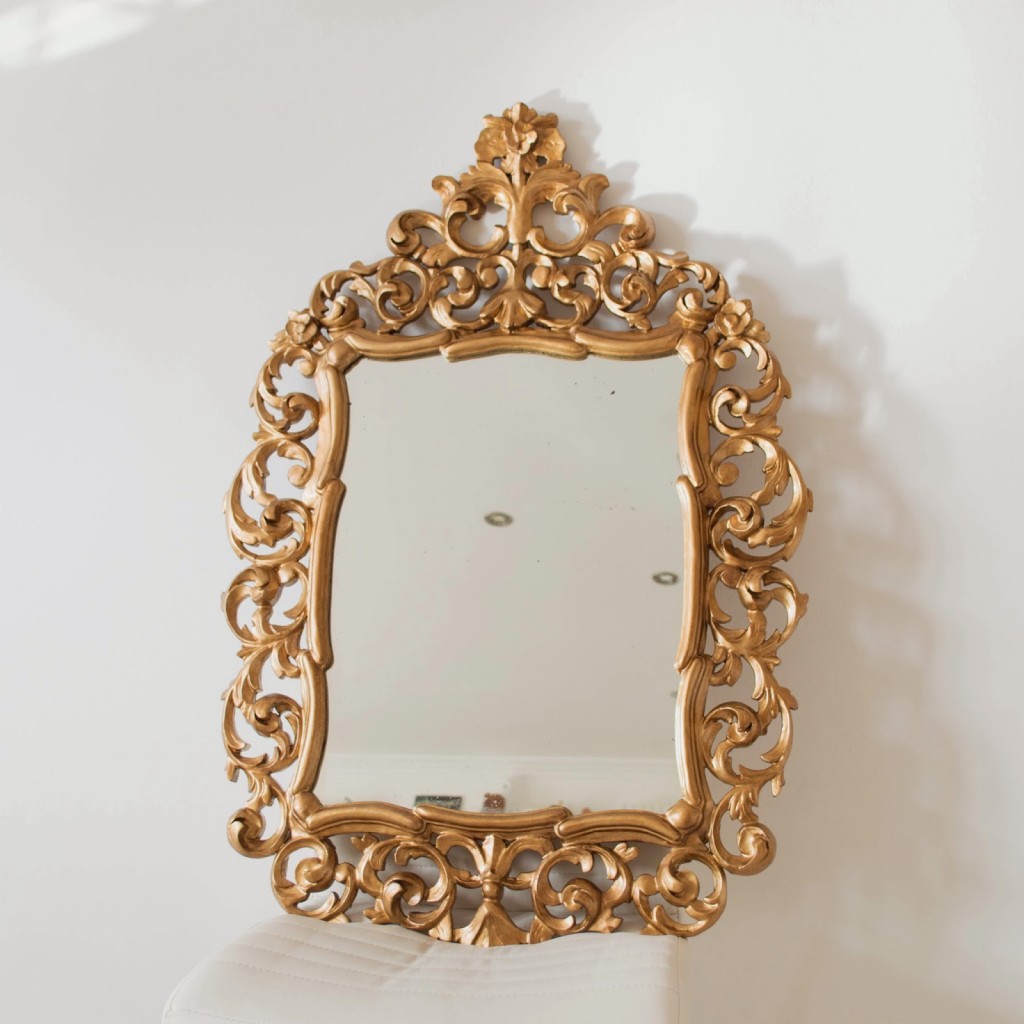 Como veis, no usamos pan de oro, que habría sido lo más adecuado para una pieza de esta época, pero la propietaria lo quiso pintado con pintura metálica dorada, así que no hizo falta pintar de color rojizo la base y procedimos a dorar el marco. El truco para que esta pintura quede bien es aplicarla con mucha delicadeza y sin estirar demasiado la pintura, con un pincel muy suave.