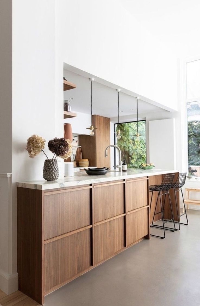 - Cocinas lineales: aquí el triángulo se transforma más en una secuencia lineal eficiente. Aunque no haya forma geométrica clara, la lógica del recorrido sigue siendo esencial.