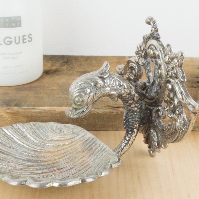 Jabonera de metal plateado, con cuerpo de pez y soporte en forma de concha. Presenta desgaste y manchas de cal en general. Realizado en Portugal en los años 30.