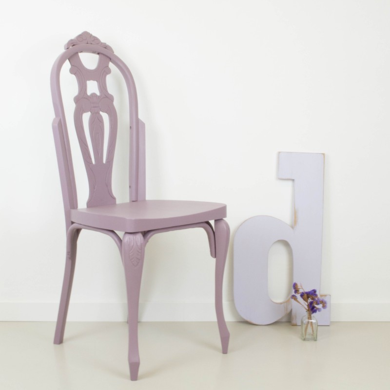 Antigua silla Mocholi de los años 60, realizada totalmente a mano, con patas curvas, ha sido restaurada: la tratamos contra la carcoma, la rascamos, y la pintamos en color violeta al agua, acabado satinado, para una combinación de inspiración romántica y bohemia. Perteneció a una vecina del barrio de Sant Narcís (Girona) y fue su hijo quien se deshizo de ella. Y aunque no sabemos su nombre, buscamos uno clásico y femenino para esta silla: Lucrecia!